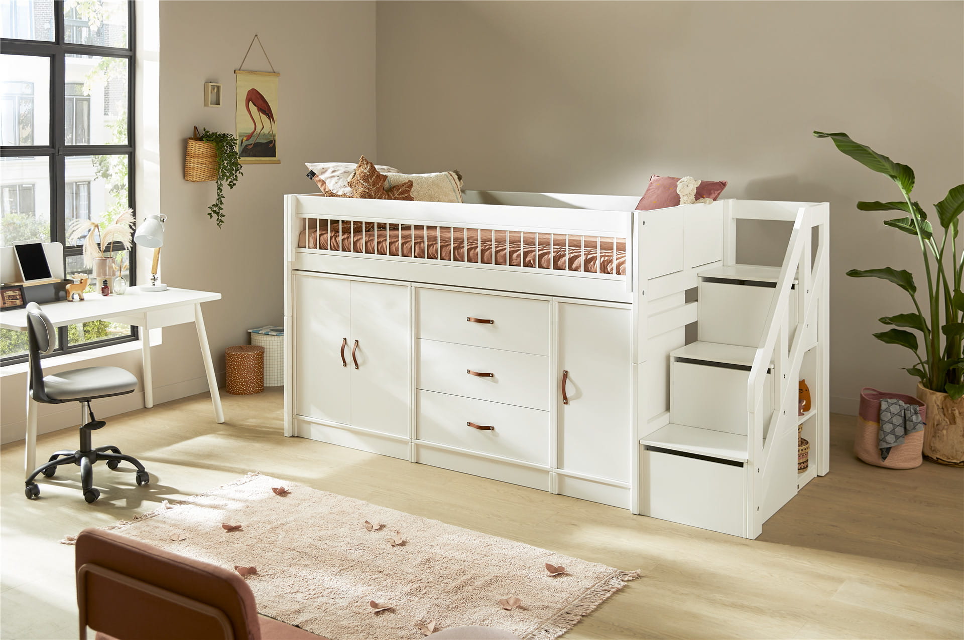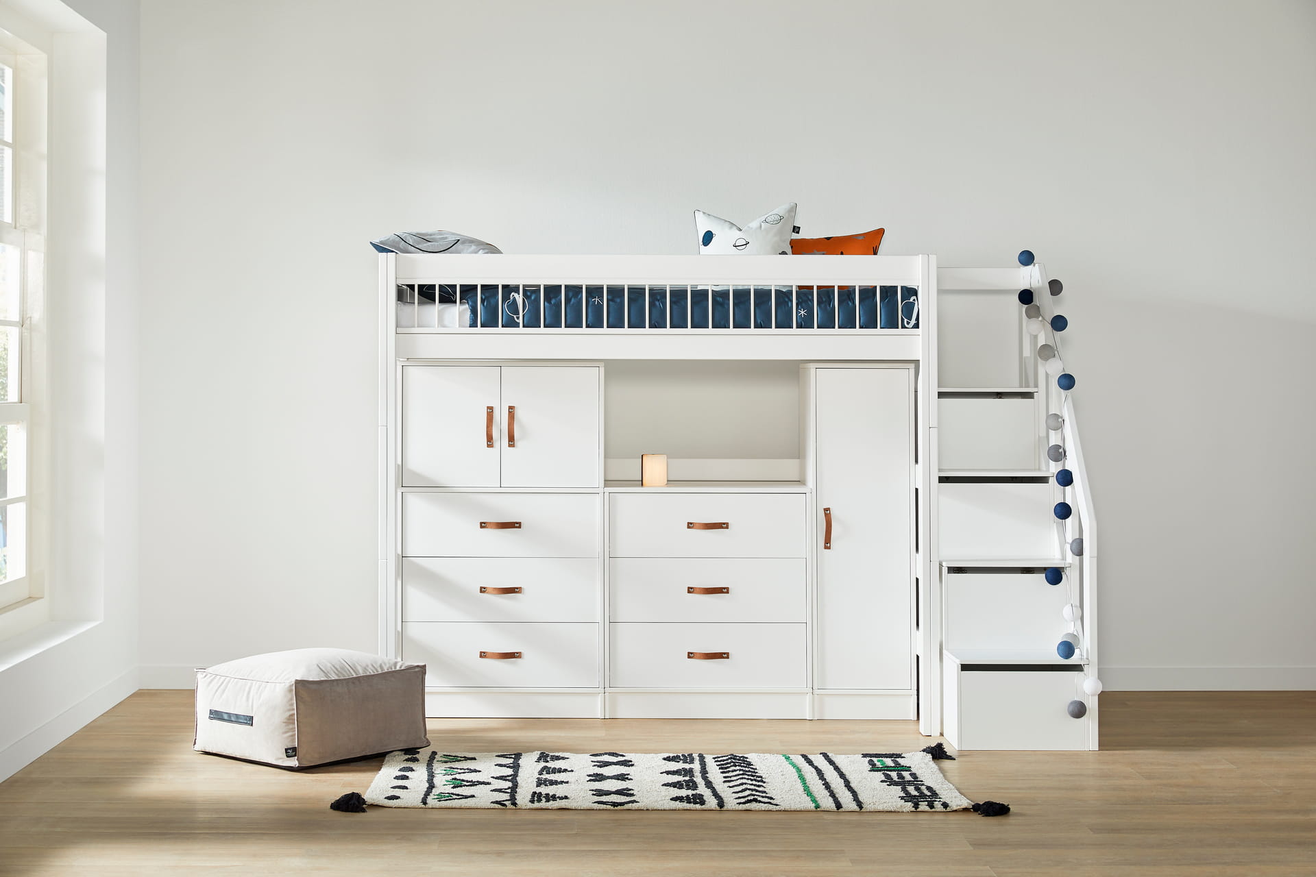 爬梯的设计,更是把“节省空间”这件事,变成了一场有趣的游戏。不像笨重的楼梯那样占地方,细细的爬梯温柔地贴在床侧,像一条通往快乐星球的小路。孩子每天爬上爬下,不是枯燥的上下床,而是一场小小的探险——正着爬是勇敢的探险家,倒着爬是调皮的小猴子,踩着梯级的每一步,都藏着童年的雀跃与欢喜。更贴心的是,爬梯还藏着“储物魔法”,梯柜的设计让每一级台阶都变成了可收纳的小柜子,放零食、放绘本、放小玩具,随手就能拿到,既节省了空间,又增添了满满的趣味性。