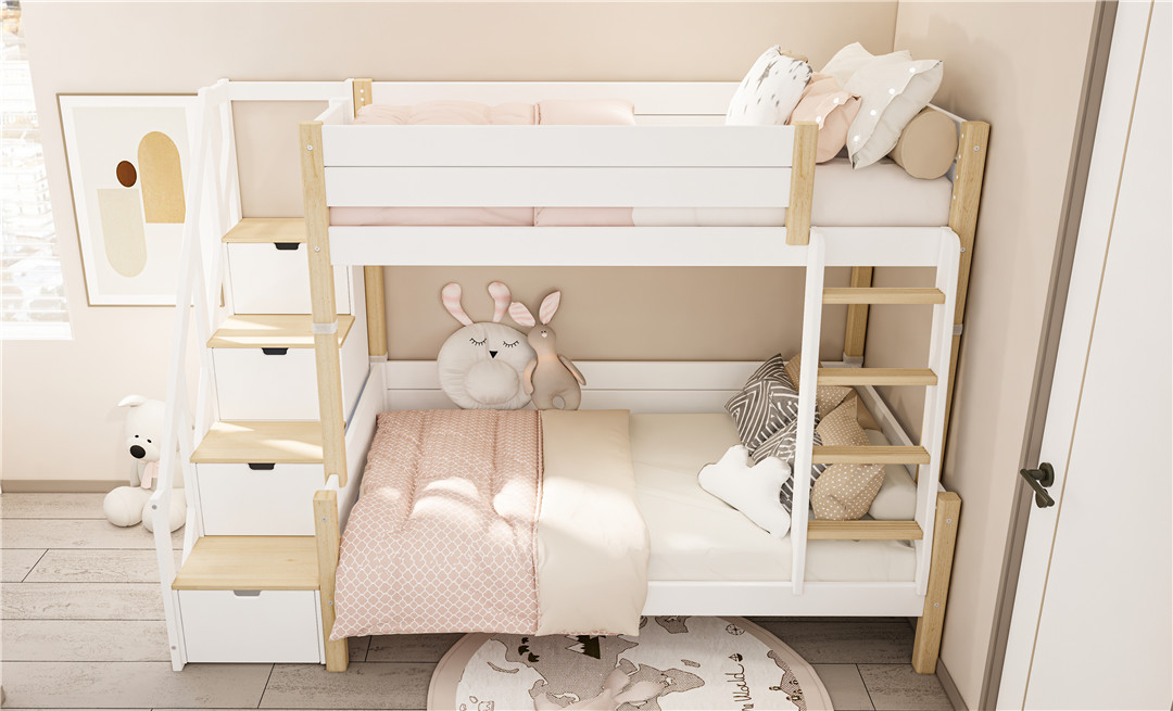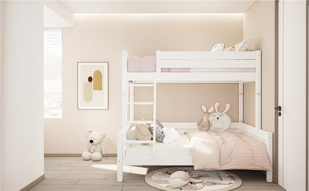最让孩子欢喜的,莫过于那级级平稳的楼梯,它不像普通的爬梯那样陡峭难攀,而是稳稳当当、步步安心,就像通往童话城堡的阶梯,让孩子学会独立上下床的同时,也多了一份探索的乐趣。清晨,孩子踩着楼梯慢慢爬上床,和阳光说早安;傍晚,踩着楼梯轻轻走下来,扑进爸爸妈妈的怀抱,每一步都踏得踏实又快乐,这份小小的独立,也在悄悄滋养着孩子的成长。