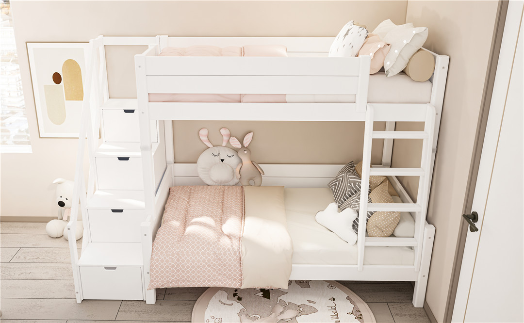 童年的快乐,往往藏在那些不经意的小惊喜里,这款儿童床的双梯设计,就是藏在日常里的小乐趣。它不像普通爬梯那样单调,双梯并存的模样,就像两条通往快乐的秘密通道,孩子们可以你追我赶地攀爬,一会儿从这边爬上上层的“小阁楼”,一会儿从那边滑下来,玩累了就趴在梯阶上休息,叽叽喳喳的笑声,瞬间填满整个儿童房。更贴心的是,这两道“秘密通道”还能自由切换——想当爬梯时,它是孩子探险的小伙伴,加厚的防滑踏板,像温柔的手掌托着孩子的小脚丫,不管是蹒跚学步的小宝宝,还是活泼好动的大孩子,都能稳稳当当攀爬,不用担心滑倒;想当梯柜时,它又变身收纳小能手,拉开每一格梯柜,就能把孩子的玩具、绘本、小衣服一一收纳,让儿童房告别杂乱,既便利又美观,把趣味与实用完美融合。